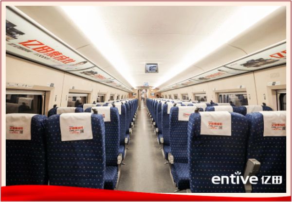 “亿田集成灶”冠名高铁列车不仅沿用了常见的外部车身/车门标贴等常见媒体,更通过对车内门贴、内部桌贴、头片、海报、品牌天幕、LED显示屏、列车广播、 车厢彩贴等所有媒体形式的覆盖,让乘客在行程中能够最大化、全方面、立体式的对亿田品牌进行坐/立/视/听/触的感受与认知。
