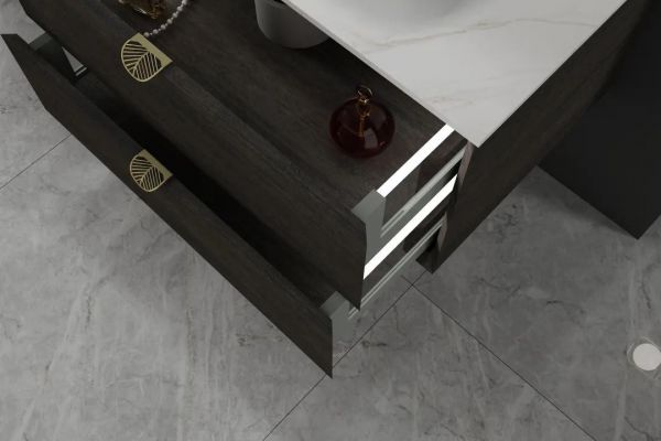 G3 -211浴室柜搭配了超大气镜面设计,大大增加了浴室的空间感和纵深感,居于期间,更倍感身心解放后的自由和放松;镜子灯光开关采用智能化手势感应控制,灯光的亮度和色度,都可以轻松调换,使用方便,体贴周到;柜体造型工艺采用了门板和侧板45度对角工艺,让产品看上去更加的极简精致,可谓完美主义者的首选。 几个并排大抽屉,极大程度上满足了卫浴空间的收纳功能,抽屉内部区隔合理,便于放置各种生活物品,以确保卫浴间的整洁和美观。