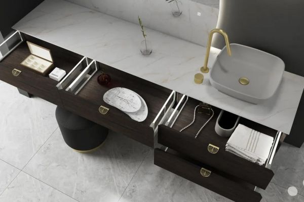 台面采用了鱼肚金岩板,这是目前非常高端时尚的板材,鱼肚金有着极致纯净的白色基底,大气的金色纹理跃动其上,仿佛是阳光照射在洁白的峰面上,给人一种明朗通透且清爽的身心舒适感;柜体天然木纹肌理均匀自然,色泽美观柔和,且自带木材清香。 而台上盆设计,让该浴室柜系列款式更显年轻时尚,加上龙头的侧装设计,不仅可以缩减台面的深度,适用于更多的狭窄空间,更方便于使用,拉近了人与镜面的距离,更舒服,也更实用。