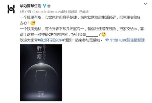 日前,@华为智慧生活 官方微博正式官宣#意想不到的CP#,“一对神秘CP帮你护家,TA们会是___?”简单的预热文字中,“护家”、“靠谱”、“安心”等关键词十分抢眼,吸引了不少网友前来竞猜,场面十分火热。