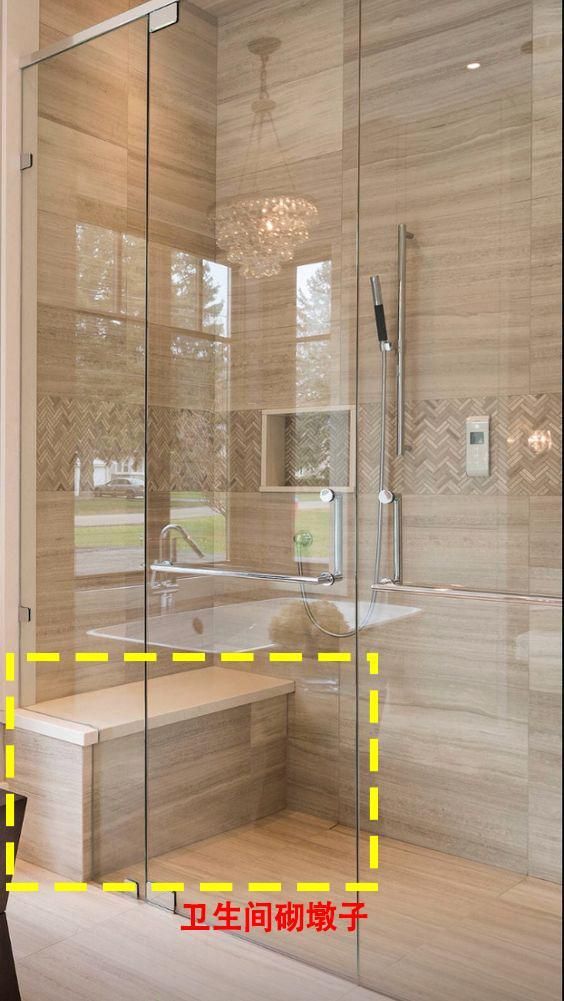 师傅说如果要做“墩子”的话,具体是砌在这三个地方:花洒对面、花洒下面、花洒左右两边。不过综合来讲,最好的位置是在花洒下面,这样就可以直接坐着淋浴,很方便。