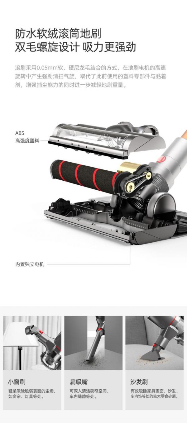 这款擦地吸尘器搭配防水软绒地刷和240ml容量的磁吸式水箱,吸尘+拖地同时完成。有了它,可以避免跪地擦拭的辛苦,也减少了对粗糙抹布和化学清洁剂的接触,让我们的手能得到更好呵护。它的超强搭配,可以搞定多元场景的清洁工作。电动软绒滚筒地刷厚度仅6厘米,可深入大部分家具底部,圆面平滑的SMOO滚筒设计能避免家具底部较长毛发以及飞絮的缠绕,并且地刷有照明灯,暗处灰尘也无处藏匿。另外,小窗刷可以轻柔吸除窗帘、灯具等脆弱物品表面的尘垢,扁吸嘴可以深入清洁门缝等狭窄空间,沙发刷可以轻松清除沙发等家具表面,电动床褥刷能实现99.9%的高效除螨。除了功能齐备,它还体态轻盈,主机身仅1.48KG,在保证性能的前提下,轻巧机身让长时间清洁也不费劲。