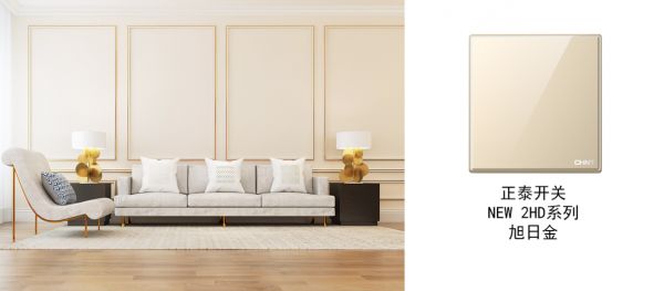 过多的金色会带来视觉疲劳,以白色、灰色等素雅的颜色为主,搭配金色点缀更显高级,例如白色墙面选择金色开关就有这样的效果。正泰开关2HD系列旭日金,温暖、明媚、奢华,营造出低调奢华的现代感,提升整体家装格调的档次。