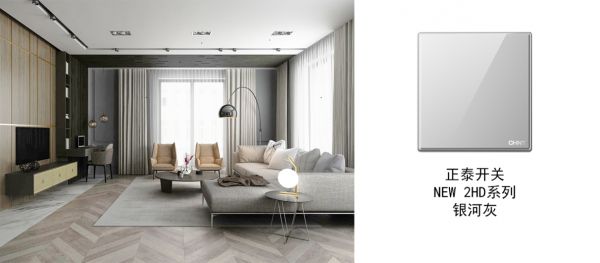 灰色家装可以适当用些玻璃材质的元素搭配,不仅增加了科技感、冷静感,而且会让空间更显通透,避免灰色压抑沉闷。正泰开关NEW2HD系列银河灰,玻璃材质光滑细腻,在光的照射下呈现流光溢彩的美感,让灰色家装瞬间高级起来。