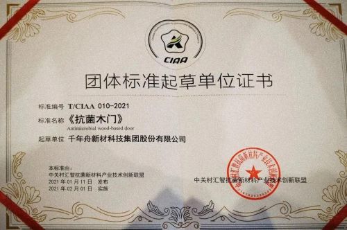 千年舟在谋求自身发展的同时,始终心系行业未来。今年3月,千年舟参与中关村汇智抗菌新材料产业技术创新联盟《抗菌木门》团体标准制定,规定了抗菌木门的术语和定义、产品分类及要求、技术要求、试验方法、检验规则和标志,并对适用范围进行了界定,对规范行业、促进产业链发展、保障消费者权益做出积极贡献。