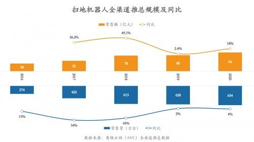 扫地机器人近年来在中国市场迅速兴起,尤其是去年突如其来的新冠疫情迫使人们居家隔离,“宅生活”时间增长,使人们更加注重家庭卫生清洁,为扫地机器人带来新的市场机遇。从市场规模来看,据奥维云网数据显示,2020年扫地机器人销售654万台,销售规模增长18%,达到94亿元。