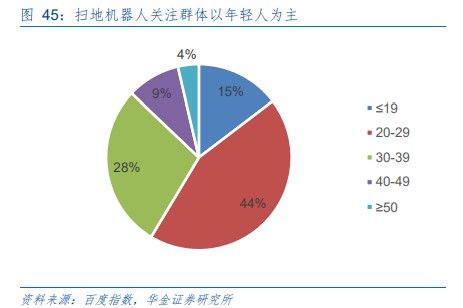 根据百度指数,目前扫地机器人的关注人群以年轻群体为主,年龄集中于20-39岁,其中20-29岁占关注人群的比例为43.97%,30-39岁占比为28.47%。作为新的消费主力军,80、90后更希望将自己从每天一次的扫地中解放出来。