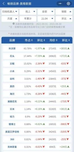 目前,线上渠道是扫地机器人销售的主力方向。从2021年4月奥维云网监测数据显示,科沃斯、云鲸、石头、由利在线上渠道的市占率稳居行业TOP5,合计达到79.25%。但随着市场的逐渐成熟,各品牌在渠道布局上的差异也逐渐开始显现。例如,石头实现了海外代理商、美国亚马逊代销和线下直销多渠道销售;而作为新锐品牌的代表,由利也在积极拓展海外市场与铺展线下礼品及智能家居平台等渠道。