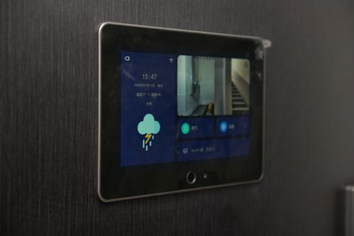 在门的内侧,它还配备有一个10英寸的高清触摸大屏,它会在人接近时自动感应亮起屏幕,及时显示门外情况,一览无余。还能同时显示户外天气等重要信息,提醒出门前换好相应衣物,安全之外,更给爱人一份暖心。