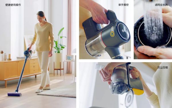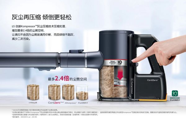 5重过滤系统+Kompressor™灰尘压缩技术。5重过滤系统,轻松应对微小杂质。悬浮气旋滤网的运用,使得气体和颗粒杂质分离,排出的空气洁净度更高,实现真正意义上的高效绿色家居清洁。LG创新研发Kompressor™灰尘压缩技术压缩处理,增加最多2.4倍的尘桶空间,让清扫不会因为尘桶装满而中断,而且倾倒不跑灰,减少二次污染;灰尘分离器、微滤网、外排风滤网均可水洗循环使用,更节能健康。