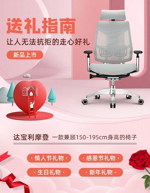 达宝利摩登椅定位于创新型礼品市场,成为让人无法抗拒的走心好礼!送食品吃完就没了;送贵重物品被收藏起来看不见了;送电子产品玩腻后被更新换代了;而送一把高颜值+多调节+大幅度的符合人体工程学的好椅子,则可始终伴随在朋友、爱人和家人身边,时刻提醒着您对她们的款款深情。