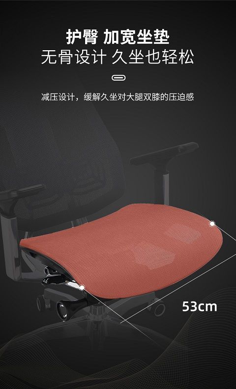 达宝利摩登椅设计了宽达53cm的护臀加宽坐垫,坐垫前端采用了流瀑式下弯设计,用户坐的时候,与大腿下平面接触的全部是绷紧的网布,而不是下弯的坐垫框架,因此能够缓解久坐对大腿双膝的压迫感。