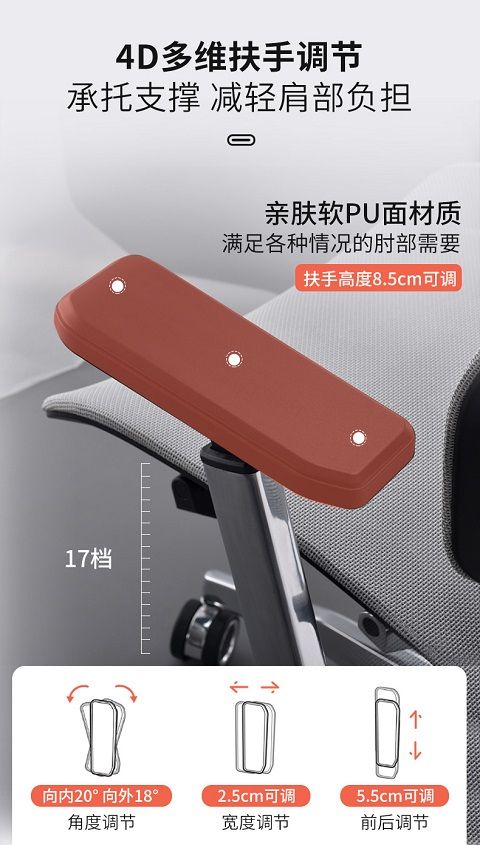 普通的座椅在高度调节方面仅有5-6个档位的粗糙调节,而达宝利摩登椅精益求精,将每个高度档位的调节细致到5mm,7cm的椅背调节细化为14个档位,4D扶手高达8.5cm的高度调节细化为17个档位,满足每位用户的细微体验。
