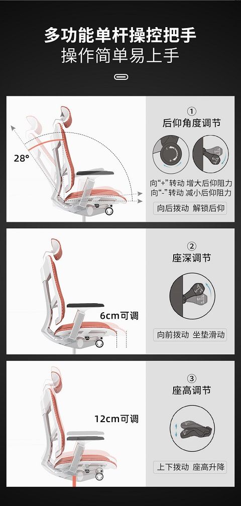 向前拨动操作杆,在6cm范围内调节座深。合适的座深为膝腘处与坐垫前端留有一指距离,臀部和大腿尽量满坐于坐垫之上,腰背部倚靠椅背,腰枕高度顶至腰椎位置。使用者挺胸抬头,呼吸顺畅。