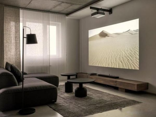 如果追求影音效果,也可以在客厅安装投影仪。看电影的时候把投影仪和幕布降下来,不看的时候隐藏起来。不仅科技感十足,还能够享受电视机所不能给的观影效果。