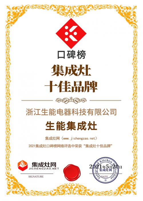 硬核实力派 生能集成灶被评为2021年集成灶口碑榜十佳品牌