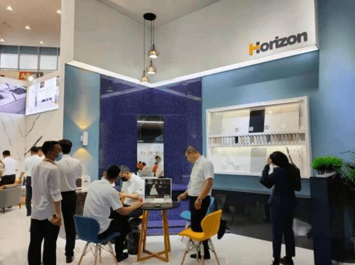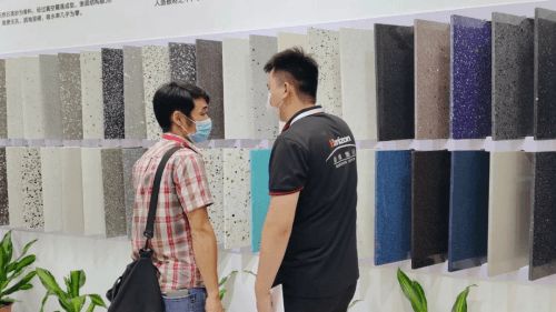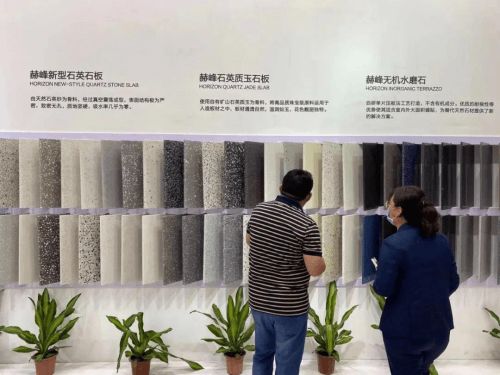 展会上,赫峰展出了石英石玉石板、无机水磨石和传统/新型石英石等多款新品,多款新品是首次亮相,全新的款式和花色,引得众多客商驻足。展会现场,颜值高、花色多、纹理天然的石英质玉石板更是占据C位,受到了广大客商的一致好评。