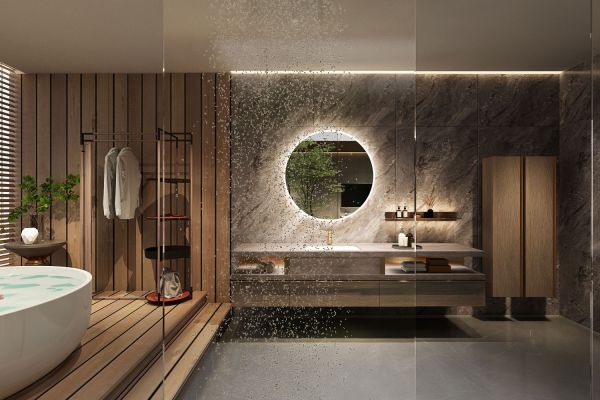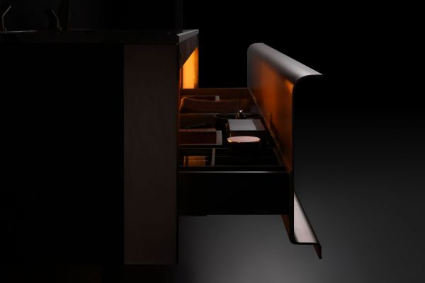 “逐日”柜子岩板、金属、灯光相结合,金属开放格在灯光的映射下闪闪发光,将追逐力量以沉浸的方式传递,为大空间设计的浴室柜,突显无法量化的奢华美。金属开放格,金属与木的结合,金属刚劲有力的感觉与木的优雅相互映衬,让力与美表达得淋漓尽致,型材拉手,与厚重的台面形成强烈的对比,视觉上减轻了整体的笨重感。