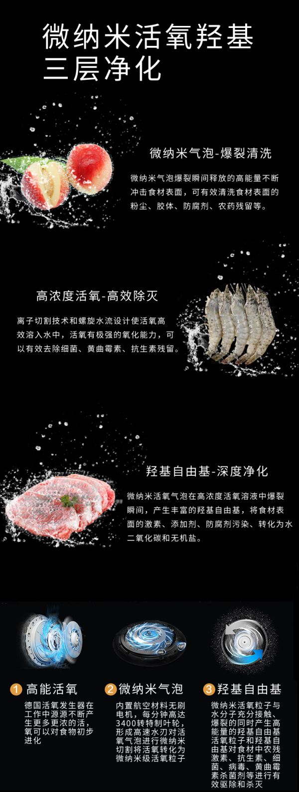 详细来说,它对日常食材的净化分为三个步骤,首先它通过德国进口氧活发生器源源不断的产生高浓活氧,将对食物形成初步的净化;再由内置的航空材料无刷电机以及实现高达每分钟3400转的转速,并配合特质叶轮形成高速水刃对活氧气泡进行微纳米切割,从而将活氧转化为微纳米级的活氧粒子;最后,这些微纳米活氧粒子将与水分子充分接触,爆裂的同时产生羟基自由基,它们将与活氧粒子共同作用,对食材中的农残、激素、抗生素、细菌、病毒黄曲霉素、杀菌剂等有害物质进行有效去除和杀灭,进一步去除水果蔬菜、鱼肉海鲜、五谷杂粮中那些看不见的“污染”,还原食材本来的健康味道。