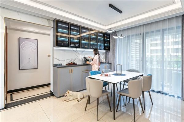 考虑多数屋主会选择把公共空间的收纳重任交给餐厅,对此联邦高登高端全屋定制特别设计了顶天立地的多功能餐边柜,这种柜体足以高效应对餐厅的使用和收纳需求,黑框玻璃柜门神秘不张扬,内设灯带展示感十足。多样化延展餐边柜功能,从上至下分成通透展示区、开放式简餐台、封闭式收纳三大区域,充分满足男女主人各自的日常使用要求。展示顶柜可以摆放主人珍藏的各类珍品、茶具,中部备餐台可放置小型家电设备,底部则是封闭储物区,可以将日用品整齐储藏。