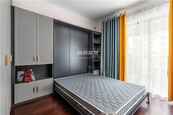 针对次卧空间的设计,以收纳置物功能为主,额外可以兼职“客房”使用,实现多功能用途。定制柜选用浅卡其布卡斯系列,搭配太空灰柜体显得静谧又养眼。定制柜内特意设置了下翻床设计,以备有客人到访需要留宿的不时之需。轻便下翻床,即便是一人操作也能轻松胜任。当下翻床收起来之后,留出的区域也可以打造成为健身休闲区或是小宠物们的活动区,用途功能丰富多变。