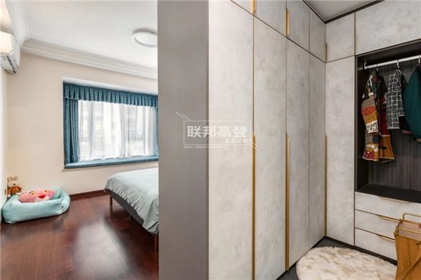 在主卧空间,联邦高登高端全屋定制打造了一个半独立衣帽间。一改常规一字型衣柜布局,极大地提升了卧室衣柜的储物性能。比起千篇一律的纯色或原木色,门板上带有独特暗纹的雪花印的设计,触感更显细腻且有光泽。配上金沙弧形拉手,可以展现整体主卧空间的奢雅气质。衣帽间内特意留出开放挂衣区,在方便平日衣服挑选穿搭的同时,也能轻松解决“隔夜衣”无处可放的问题。并对卧室飘窗位置进行了合理利用,打造置物区和梳妆台的结合。在充当床头柜和梳妆区使用的同时,也为屋主的美妆护肤用品提供充足收纳位置。