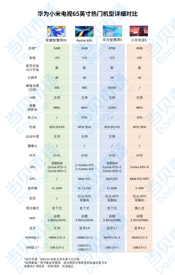 5000预算,买华为的65寸电视还是小米的?哪个性价比更高?