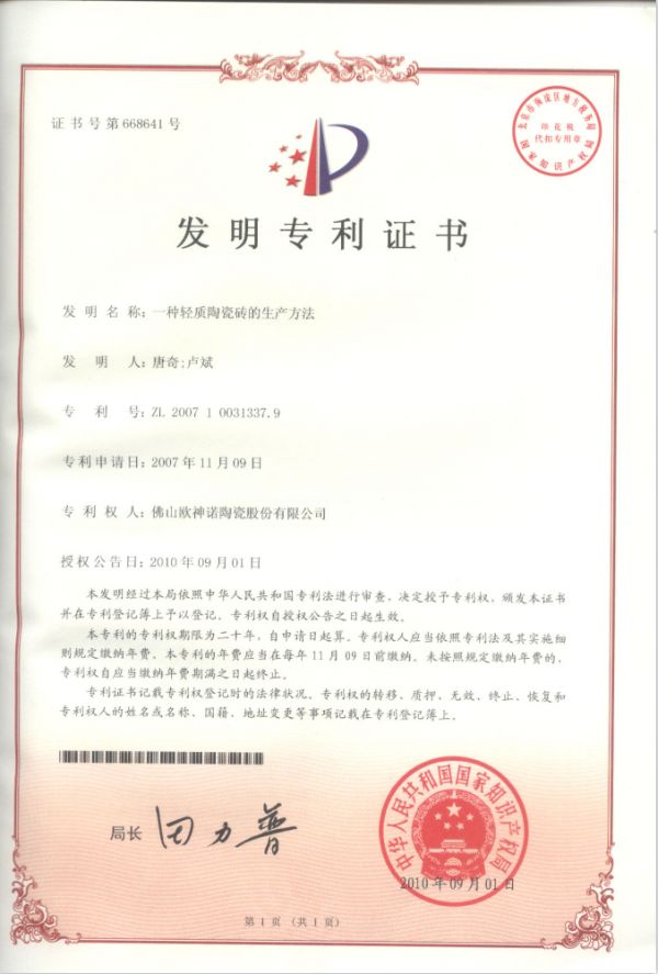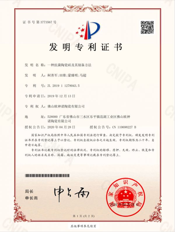 正是在科研创新平台与高科技人才队伍的支撑下,欧神诺交出了斐然的成绩。截至目前,欧神诺共参编国家、行业、团体标准20项,已获得有效专利177项,其中发明专利45项、实用新型专利27项、外观专利105项。