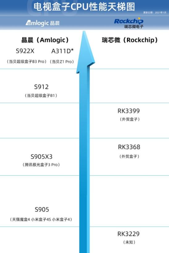 一台电视盒子,处理器的好坏就直接决定了它的命运。目前市面上比较出名的处理器芯片,大致有晶晨、瑞芯微、mtk、全志等。其中晶晨芯片最为常见,大家普遍使用的小米盒子、当贝超级盒子、天猫魔盒等都是使用的晶晨芯片。