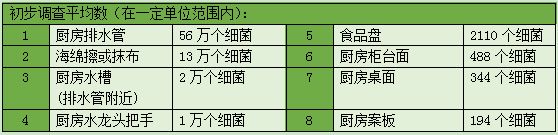 有人说细菌不一定是有害的,但是经实验,厨房的台面和用具往往滋生出大肠菌群、霉菌、沙氏门菌、粪球菌等有害细菌。沙门菌抵抗外界力较强,在水、肉类食品中可存活一年,还有一些发霉的饭菜,含有国家一级致癌物黄曲霉素,这堪比砒霜还要毒68倍。