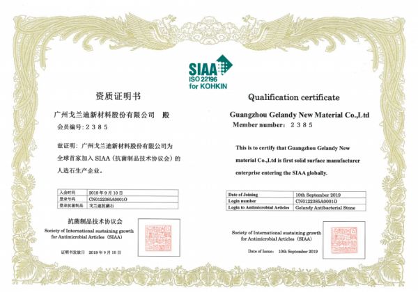 戈兰迪是全球首家加入日本SIAA抗菌协会的人造石企业(日本SIAA认证标志是由抗菌制品技术协会自1998年起开始使用,代表符合标准规定、可被信赖的产品,在抗菌性、安全性及标注方面都要求很高),并且拥有十余年抗菌技术和实践经验。