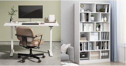 (左:松能电动升降桌、右:蔓斯菲尔落地收纳架多功能书架)