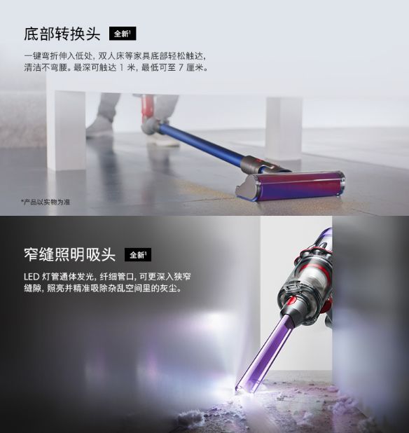 狗狗如果在家里面乱跑,毛掉在了床底、茶几下、各种窄缝里面,没有办法清理怎么办呢?难道要把床挪开之后清理吗,别担心,戴森V11早就考虑到了这个情况。在戴森V11上,配备了底部转换头,这个转换头可以一件弯折深入低处,像床底、茶几底部都可以轻松到达,清理卫生根本不需要弯腰,这个吸头最深可到1米深处,最低可以底至7厘米。