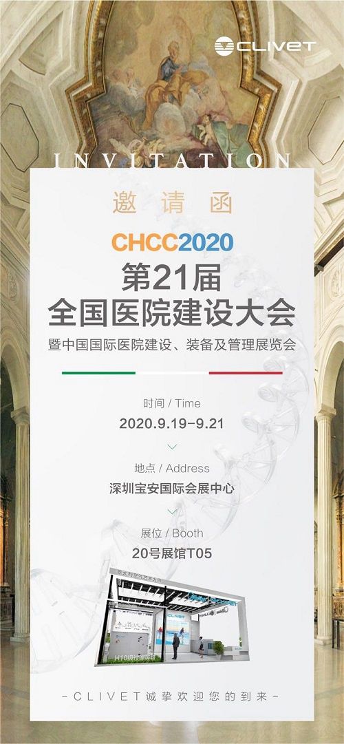 9月19~21日,第21届全国医院建设大会暨中国国际医院建设、装备及管理展览会(CHCC 2020)将在深圳国际会展中心举办,意大利高端中央空调品牌CLIVET携旗下众多产品将受邀亮相。
