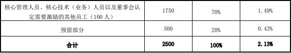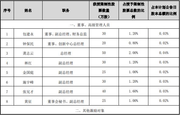 草案显示,本次激励计划拟授予限制性股票数量为2,500万股,约占本激励计划草案公告时公司股本总额 117,300万股的2.13%。其中首次授予2,000万股,约占本激励计划草案公告时公司股本总额117,300万股的 1.71%;预留500万股,约占本激励计划草案公告时公司股本总额117,300万股的0.43%,预留部分占本次授予权益总额的20%。