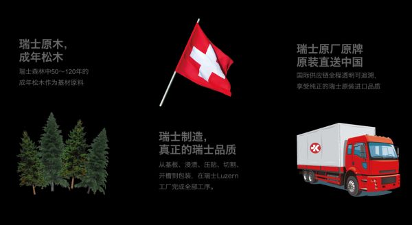 从原木加工开始,基板、浸渍、压贴、切割、开槽和包装,瑞士卢森的每一块板材,都确保是在瑞士的卢森工厂内完成,并执行严格的生产管理流程。先进的生产线和技术高超的工人,细致打磨瑞士卢森的每一块板材,确保每一块到达中国市场的板材都由瑞士原厂直送。