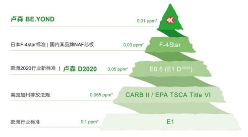 比起外观款式的革新,环保性能的提升是瑞士卢森更为重视的发展方向。瑞士卢森板材执行了更为苛刻的环保标准,它依照2020年欧洲行业新排放法规E0.5执行,大大优于行业内其他执行CARB II标准的品牌。瑞士卢森的BE.YOND别漾零醛添加刨花板的甲醛释放量甚至不超过树木本身的释放量。
