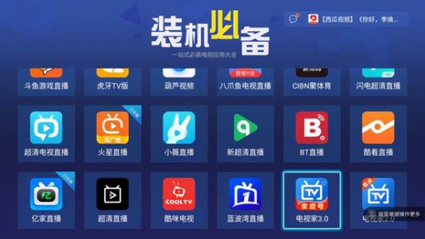 2.在装机必备TV版里找到直播软件(火星直播、电视家3.0、小薇直播等)并安装