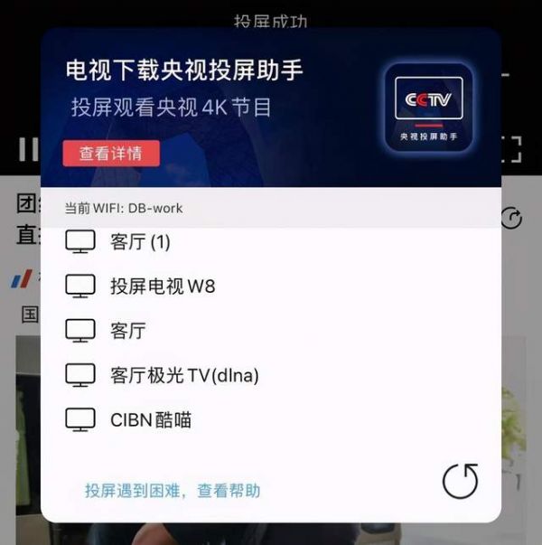 3.将电视和手机设置成同一个wifi,打开手机端CCTV5频道,点击右上角的投屏,找到相关设备后,即可完成投屏。