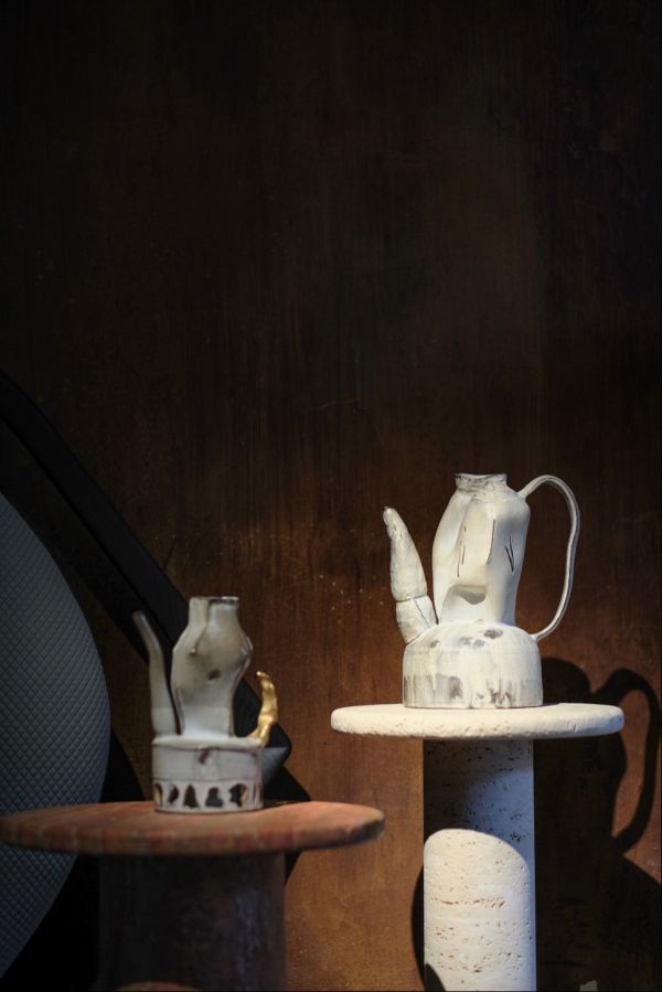 此次展览吴非以「生长」为主题制作的艺术橱窗,主雕塑的灵感来源于梵几的螳螂椅作品,将螳螂椅的局部与陶瓷雕塑相结合,两种均来自于自然的材料—“木的柔软,与瓷的坚硬”是一种边界的尝试,也是新物质的生长。同时梵几的Slogan是生长于野,安于室,以自然为灵感,试图打破自然与生活空间的边界,在创作之中,恰有契合之处。通过解构的方式把吴非的作品和梵几的螳螂椅相结合,形成一个新的物质状态,是吴非也是梵几。此次艺术橱窗将与展览同期上线。结合家具与陶瓷,让几何与有机形态融合生长。