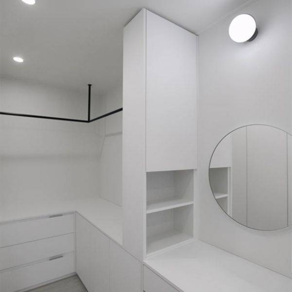 首先为了保证储物空间,给一边靠墙空间打上柜子,满足衣物等物品的存放,不愁没地存储,对于不超过三口的家庭来说,都比较适用。可以给柜子一边留出一部分空间,做个嵌入的窄开放式置物架,方便拿取常用的小物品。
