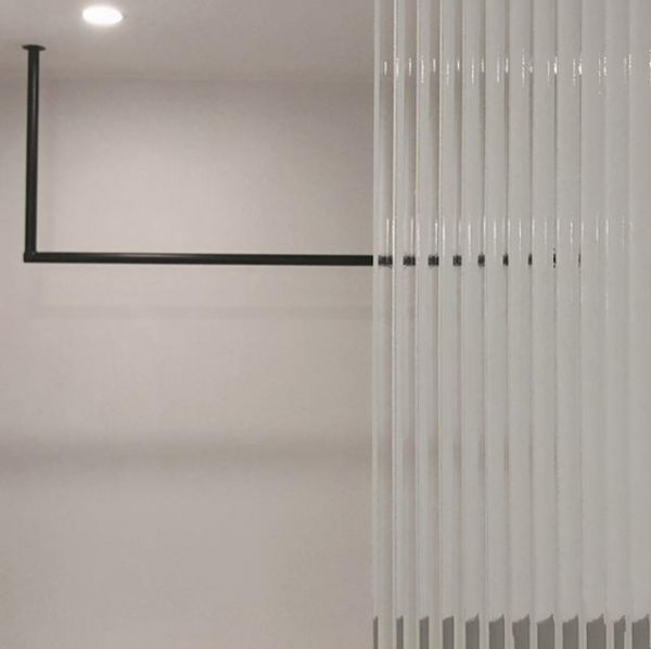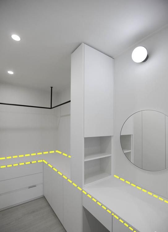 至于梳妆台和晾衣区如何划分,矮台面中间加个到墙顶的矮柜就可以起到隔断的作用了。矮柜本身也自带存储空间,平时常用的化妆品都可以置放在上方,省的堆叠的到处都是的烦恼,看得干净收拾起来也方便啊。