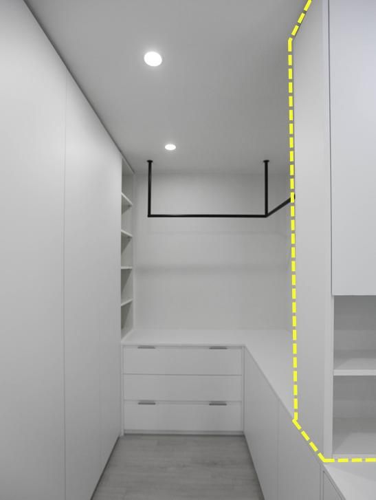 但是今天要给大家介绍的这种设计不同,衣帽间内部一边打上到顶柜子,另一边做L型的台面,中间加个到顶矮柜做隔断,一分为二一边做衣物晾晒,一边做梳妆台,却意外的在全小区火爆。