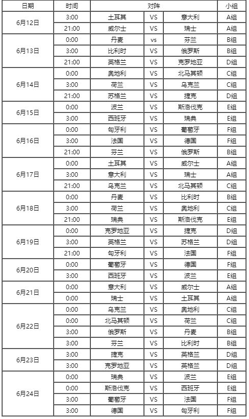 这个夏天,让我们一起期待新的欧洲霸主的诞生吧!小编在这里提醒各位,合理安排好时间,不要过度熬夜追球赛而影响身体健康哦~最后附上本届欧洲杯的详细赛程,可供各位球迷们参考!