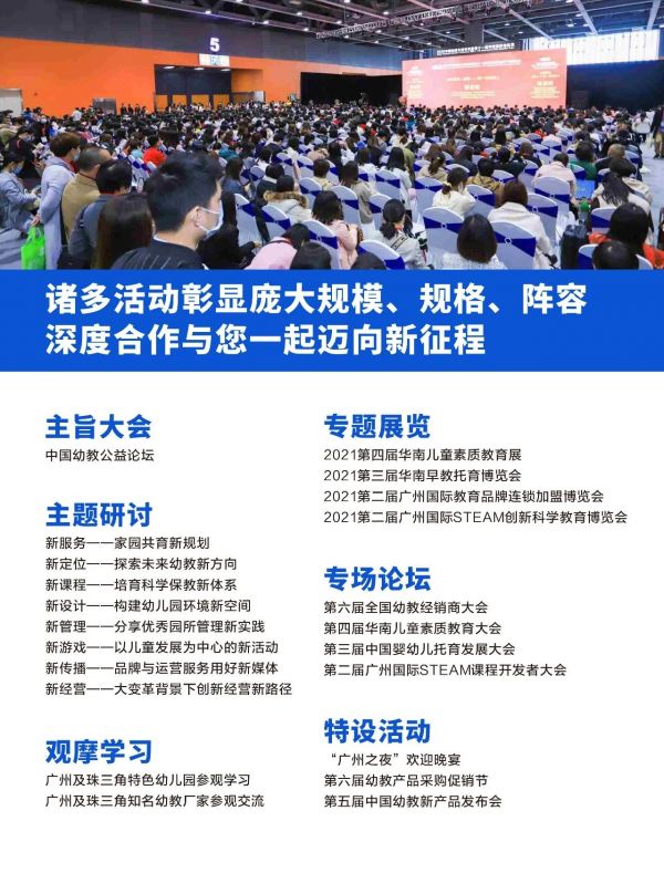 6月5日-7日,2021中国幼教公益论坛第十二届华南国际幼教产业博览会将在广州琶洲保利世贸博览馆举行。展会同期召开中国幼教公益论坛、2021第四届华南儿童素质大会暨展览会、2021第三届华南早教托育博览会、2021第二届广州国际教育品牌连锁加盟博览会、2021第二届广州国际STEAM创新科学教育博览会。