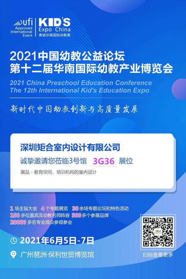 矩合设计在对文化教育行业的研究与洞察,在把握趋势的前提下进行创新设计,做面向未来的设计。以“躬身入局,挺膺负责”为企业使命,矢志成为中国最具有影响力的教育空间设计机构。届时,设计师们将携带设计新作与建筑模型在广州琶洲保利世贸博览馆二楼3号馆3G36展厅与幼教产业链上下游、专家学者、优秀园方代表人进行学习与交流。