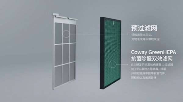 Coway科唯怡art square产品除了室内装饰效果外,在空气净化器滤网性能方面也很出色。特别是搭配了Coway科唯怡自主开发的GreenHEPA滤网,不仅可以去除微尘、甲醛,还可以去除空气中99.99%以上的病毒、细菌、霉菌和花粉,并使细菌和病毒灭活。这款滤网在空气净化器滤网中最重要的集尘性能方面上是非常优秀的,可以捕捉空气中0.01㎛大小的微尘、病毒、细菌等。滤网中的病毒、细菌、霉菌通过GreenHEPA滤网上的抗菌剂可有效地灭活,去除率达到99.99%以上。也就是说,可以很好解决之前其他品牌的HEPA滤网中对细菌病毒只过滤却不能彻底去除的功能问题。