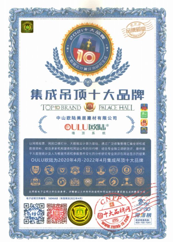 此次评选结果以网络投票、网民口碑打分、大数据云计算为基础,通过广泛收集整理汇编全球权威数据资料,综合多家机构媒体和网站公布的排行榜,结合专业独立调研测评,最终基于大数据统计参数条件变化的分析研究专业测评在网站显示的结果,OULU欧陆美居为2020年4月-2022年4月集成墙面十大品牌。
