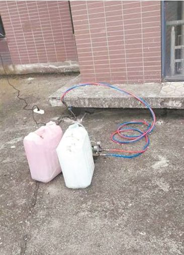 昨日,王先生指着家中外墙脚下几个钉孔告诉记者,“当时师傅拎了两只装满胶水的桶,没任何标签,拿自带电子秤称重一桶54斤,一桶56斤,插了针管装置,用软管抽胶水打入墙体”。