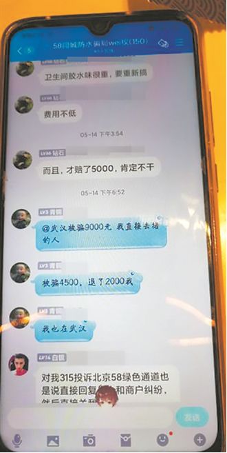 24日下午,记者致电58同城客服,答复是给王先生上门补漏的不一定是平台注册商家,建议报警处理。而据王先生介绍,遭此经历后,意外发现了有一个“58同城防水骗局wei权”的QQ群,该群自去年7月建立至今成员已有150多人,都是与他一样受骗的消费者,受骗金额从数千元到数万元不等,最高达5万元。“补漏人有共同特点,都是安徽的,开皖S牌照车。”王先生怀疑这就是一伙骗子。
